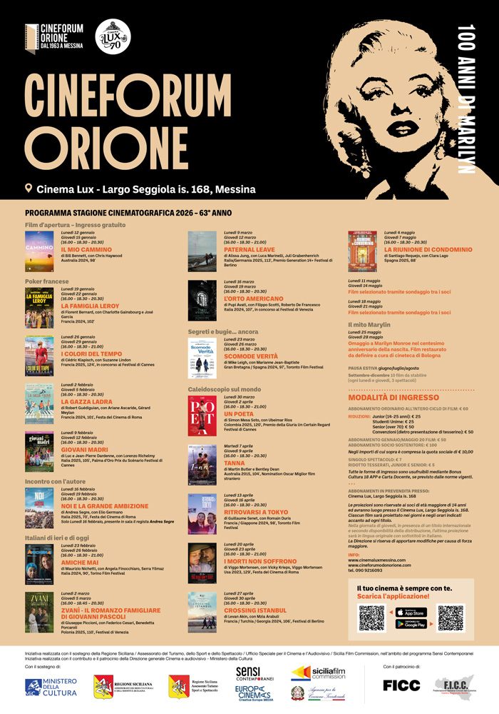 Messina, 8 gennaio – Il Cineforum Orione, in collaborazione con il Cinema Lux, presenta la 63esima Stagione Cinematografica, che rappresenta un nuovo viaggio attraverso il cinema d’autore contemporaneo, tra grandi firme internazionali, nuove voci, film premiati nei principali festival e appuntamenti speciali.